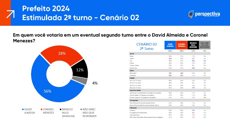 A pesquisa aponta uma eleição em dois turnos e a liderança do prefeito David Almeida (Avante) em todos os cenários no primeiro turno e no segundo turno.