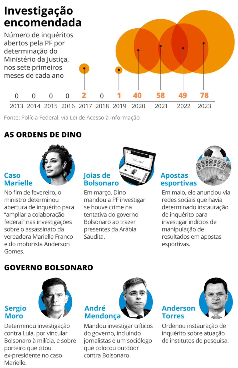 O ministro da Justiça, Flávio Dino, ainda não havia completado um mês no cargo quando anunciou, no fim de janeiro, que havia determinado à Polícia Federal que investigasse a possibilidade de o ex-presidente Jair Bolsonaro ter cometido genocídio de povos ianomâmis durante seu governo. Dino mostrava ali uma prática que se repetiria com frequência nos primeiros sete meses deste ano. Dados obtidos pelo GLOBO mostram que a atual gestão do Ministério da Justiça e Segurança Pública bateu recorde no número de pedidos de instauração de inquéritos à PF, corporação que é vinculada à pasta, com 78 investigações.