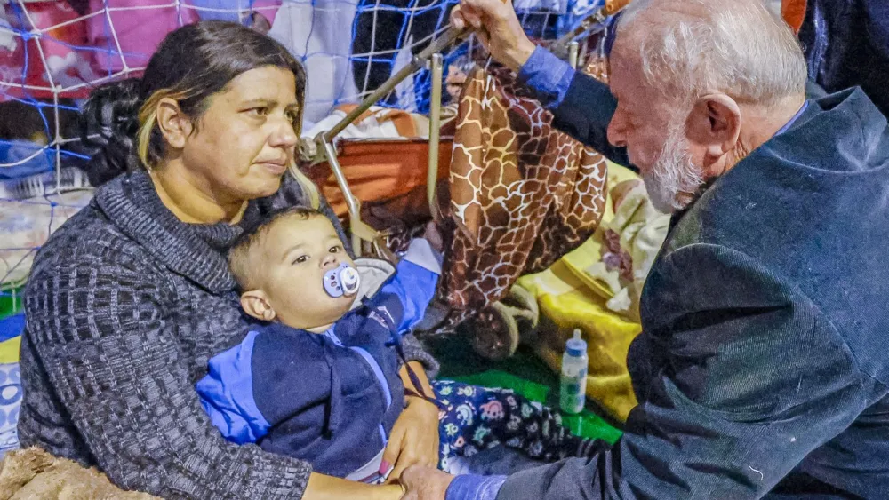 O presidente Luiz Inácio Lula da Silva visitou nesta quarta-feira, 15/5, um abrigo na cidade de São Leopoldo, Rio Grande do Sul, na região metropolitana de Porto Alegre. Ele estava acompanhado da primeira-dama Rosângela da Silva, a Janja, pelo governador do estado, Eduardo Leite (PSDB), e por ministros e autoridades que participam da comitiva presidencial.