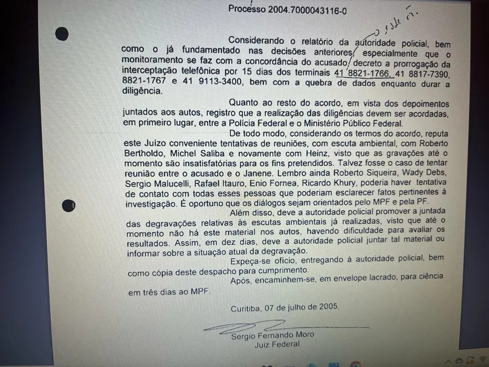 A decisão foi assinada pelo ex-juiz no dia 7 de julho de 2005 e consta no processo que tinha como base a colaboração de um ex-deputado estadual do Paraná, Tony Garcia. Nela, Moro solicita textualmente, por escrito, que Tony tentasse gravar conversas com deputados federais e com o presidente do TCE-PR.