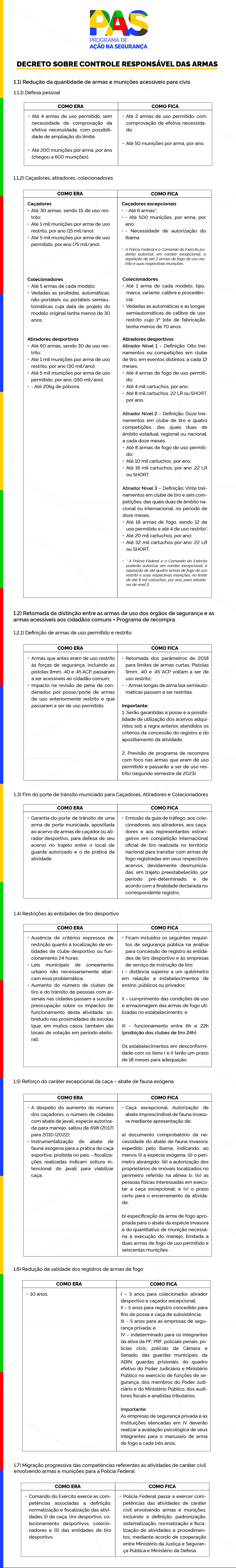 A norma também decreta o fim do porte de trânsito municiado para caçadores, atiradores e colecionadores; restrições às entidades de tiro desportivo; redução da validade dos registros de armas de fogo; e a migração progressiva de competência referente às atividades de caráter civil envolvendo armas e munições para a Polícia Federal.