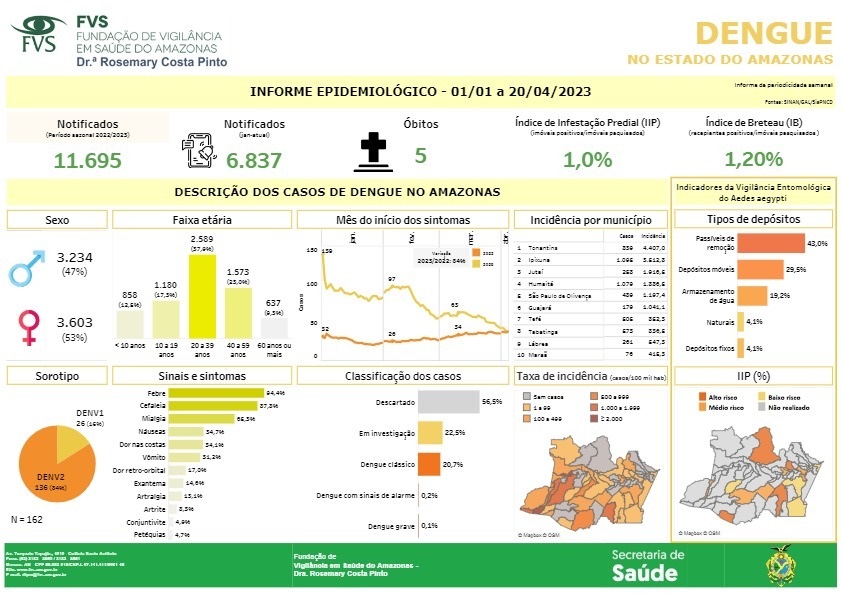 A Fundação de Vigilância em Saúde do Amazonas – Drª Rosemary Costa Pinto (FVS-RCP), vinculada à Secretaria de Estado de Saúde do Amazonas (SES-AM), atualiza, nesta quinta-feira (20/04), o cenário de dengue no Amazonas. A edição do informe epidemiológico está disponível no site da FVS-RCP, com acesso direto pelo link: https://bit.ly/41FcVLD.