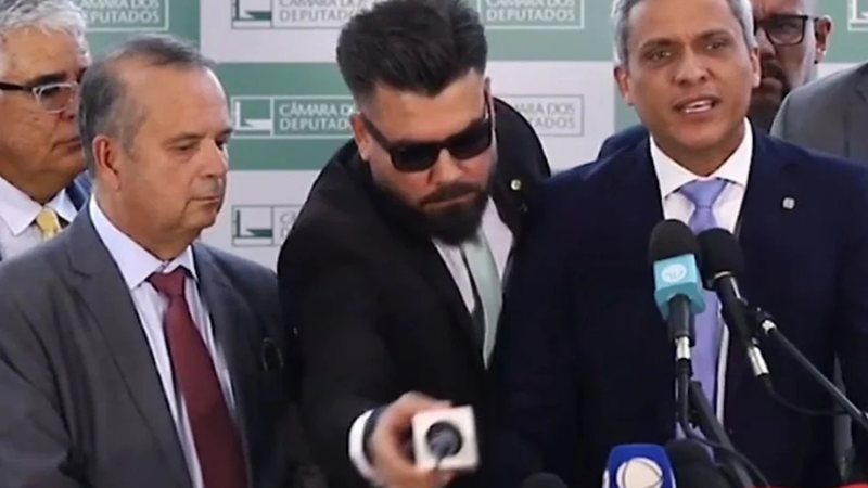 Em seguida, Caveira pegou o microfone da emissora e colocou o objeto no chão. Marinho repreendeu a atitude, dizendo “faça isso não” seguidas vezes. Após a bronca, o deputado federal Hélio Lopes (PL-RJ) colocou o microfone de volta ao púlpito.