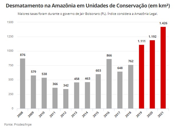 Foi justamente durante esses três anos do governo Jair Bolsonaro que o desmatamento em unidades de conservação pontuou as maiores taxas da série histórica (veja gráfico abaixo).
