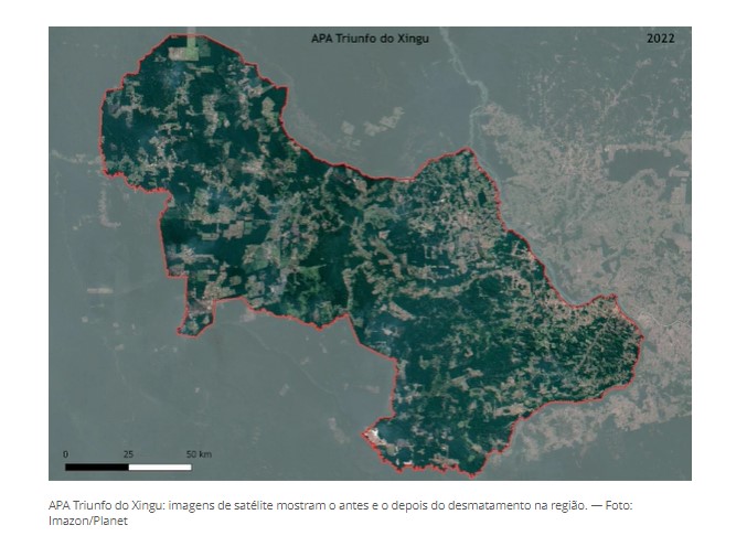 Na primeira comparação de imagens de satélite, é possível ver trechos de desmatamento em 2020, 2021 e 2022 na Área de Proteção Ambiental Triunfo do Xingu, na bacia do rio de mesmo nome.