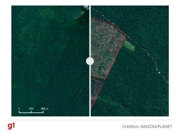No destaque acima, é possível ver uma área de 1,5km² desmatada na Floresta em uma foto de maio de 2022.