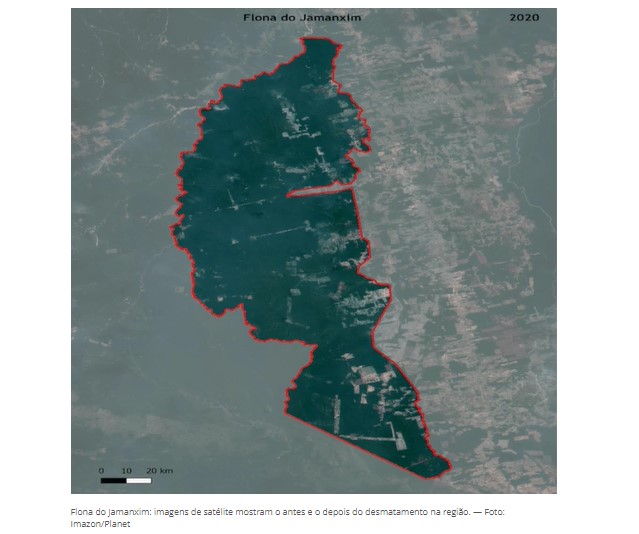 Na segunda imagem o destaque é a Floresta Nacional do Jamanxim, um área de 1,3 milhão de hectare também no sudeste do Pará, na cidade de Novo Progresso. Na imagem, também é possível ver trechos de desmatamento entre 2020 e 2022.