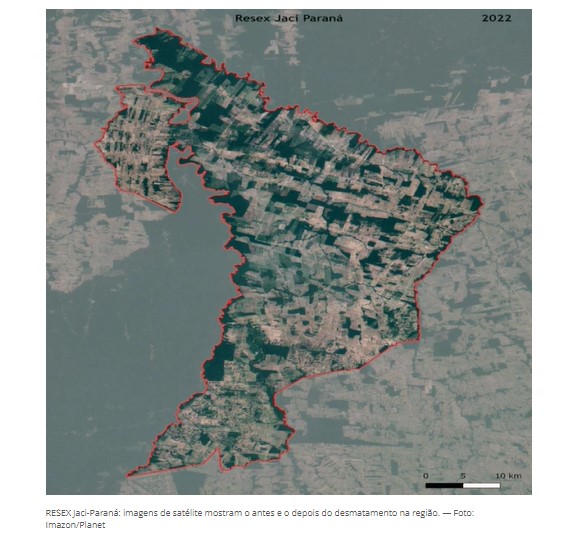 Na terceira e última imagem vemos as transformações do desmatamento entre 2020 e 2022 na Reserva Extrativista Jaci-Paraná, em Rondônia, uma unidade de conservação de mais de 196 mil hectares até 2021.