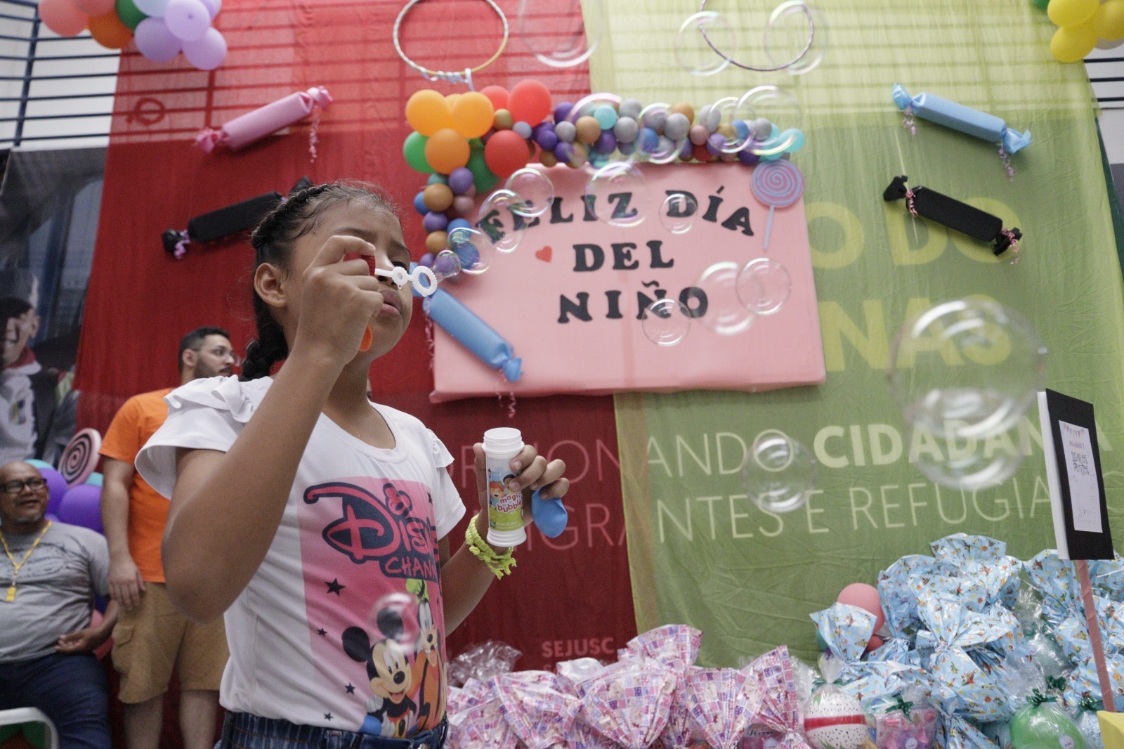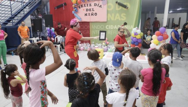 “A gente não sabia que teria essas brincadeiras, ficamos alegres quando vimos. Meus filhos estão se divertindo, já tomaram sorvete e estão brincando com os palhaços. É muito bom ver que existe esse cuidado, fico feliz por eles”, entregou a migrante.