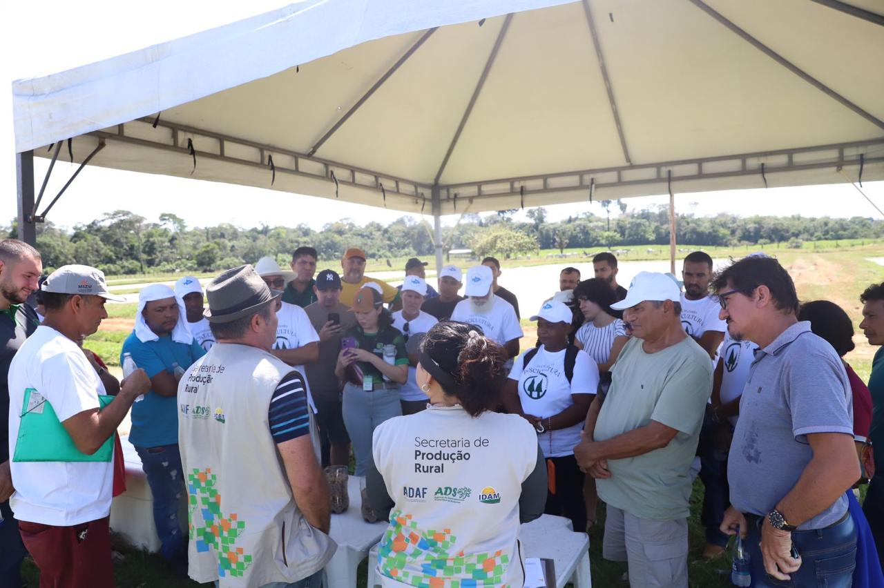 Além da estação de práticas no uso e armazenamento de rações liderada pela Sepror, na fazenda foram dispersas três estações que destacavam o Licenciamento Ambiental e Carteira do Produtor Rural pelo Idam e financiamento para piscicultura pela Afeam. Os produtores foram orientados pelos técnicos sobre as etapas e documentos que necessitam para realizar serviços da instituição.