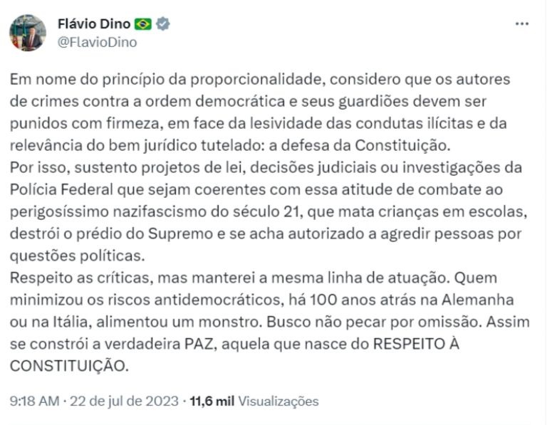 "Em nome do princípio da proporcionalidade, considero que os autores de crimes contra a ordem democrática e seus guardiões devem ser punidos com firmeza, em face da lesividade das condutas ilícitas e da relevância do bem jurídico tutelado: a defesa da Constituição. Por isso, sustento projetos de lei, decisões judiciais ou investigações da Polícia Federal que sejam coerentes com essa atitude de combate ao perigosíssimo nazifascismo do século 21, que mata crianças em escolas, destrói o prédio do Supremo e se acha autorizado a agredir pessoas por questões políticas", tuitou o ministro da Justiça na manhã deste sábado (22).