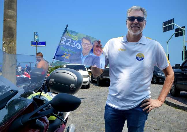 Rodrigo acompanhava uma 'motociata' que promovia um candidato do PL, o mesmo partido de Bolsonaro, e só encostou a moto porque ela começou a esquentar. Além da bandeira, ele também carrega um adesivo grudado na camisa com o rosto do presidente da República.