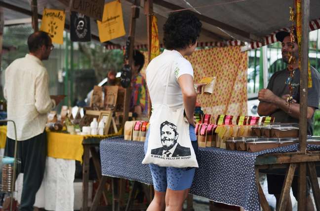Animado com sua primeira venda, o dono da barraca sugeriu que a cliente comprasse um pano vermelho estampado, com o rosto de Lula em quase todo o tecido, por R$ 10. "Deixa só ver se eu tenho dinheiro trocado", disse ela, antes de pagar e guardar o pano na bolsa.