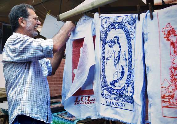 A barraca é de Osvaldo, que trabalha com serigrafia há trinta anos e aposta no público de Laranjeiras para vender produtos com imagens de Lula e do PT. "Eu gosto do Lula, acho ele um gato", ri Osvaldo, que chega a vender cerca de 40 panos na feira.