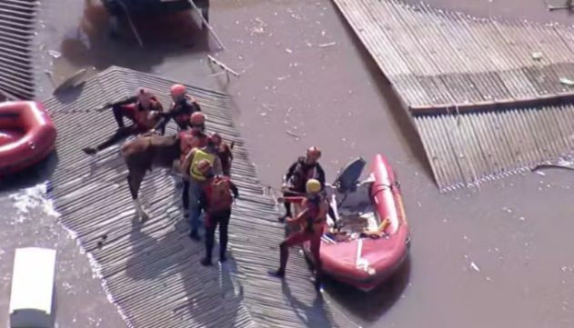 Animal ficou ilhado após as fortes chuvas que atingiram o Rio Grande do Sul. Para ser retirada do local, égua foi sedada e colocada em um bote.