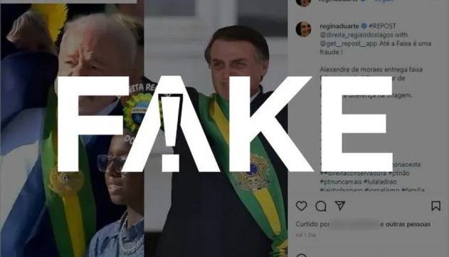 "Até a faixa é uma fraude! Alexandre de Moraes entrega faixa fake para o ladrão posar de presidente! Confira a diferença na imagem", diz a mensagem falsa compartilhada pela atriz Regina Duarte no Instagram e por várias contas em outras redes sociais.