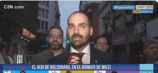 Eduardo Bolsonaro viajou à Argentina em comitiva com outros dois congressistas brasileiros, para acompanhar a votação com o deputado libertário da província de Buenos Aires, Nahuel Sotelo, segundo o partido argentino. Segundo os parlamentares, o candidato “tem representado para os argentinos e para o mundo, especialmente para o Brasil neste momento, o enfrentamento às ameaças e ataques dos seus adversários políticos”.
