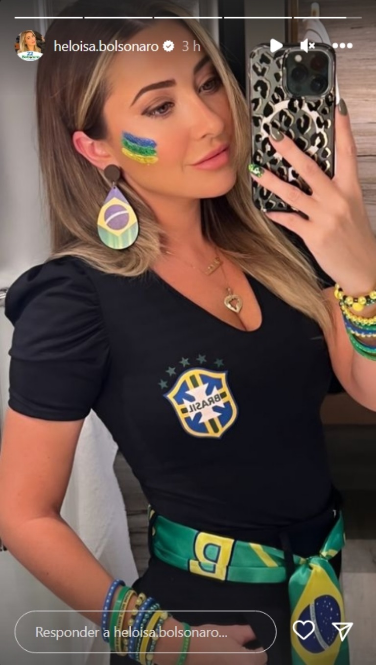 Nas redes sociais, Eduardo Bolsonaro não fez nenhuma menção à viagem à Doha para acompanhar o mundial. No entanto, a esposa, Heloísa, revelou nos stories do Instagram o modelito que iria ao estádio - o mesmo que foi flagrado pelo canal de Casimiro.