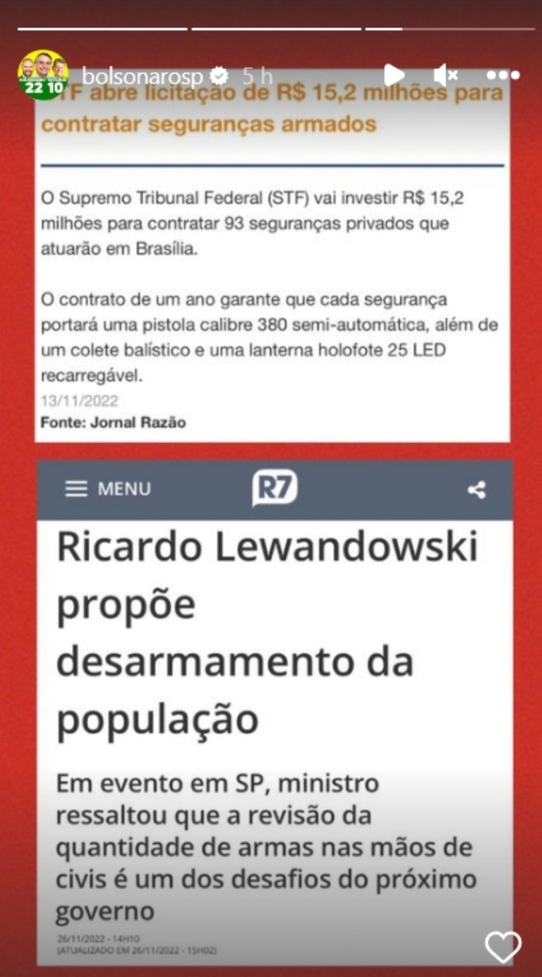 Escondendo a ida à Copa para evitar uma revolta dos apoiadores, Eduardo tem feito publicações incitando os atos golpistas. A última delas foi nesta segunda, quando atacou o ministro Ricardo Lewandowski por propor o desarmamento, enquanto o STF abre licitação para segurança armada.