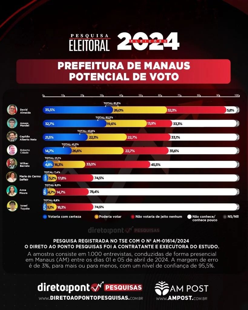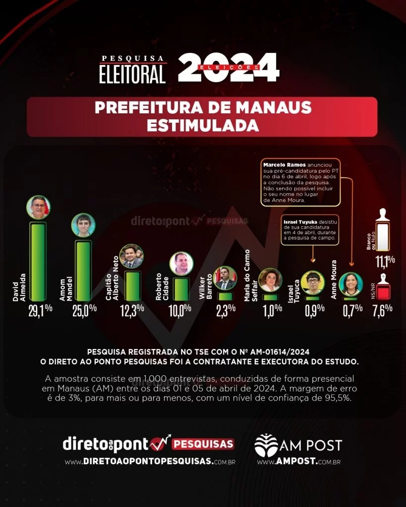 O Direto ao Ponto Pesquisas, em parceria com o Portal AM POST, divulga nesta segunda-feira, 8/04, pesquisa sobre a disputa pela prefeitura de Manaus. De acordo com cenário estimulado o prefeito de Manaus, David Almeida (Avante) lidera a corrida eleitoral com 29,1% das intenções de voto, seguido pelo deputado federal Amom Mandel (Cidadania), com 25%, pelo deputado federal Capitão Alberto Neto (PL), com 12,3% e pelo presidente da Assembleia Legislativa do Amazonas, deputado estadual Roberto Cidade (União Brasil), com 10% das intenções de voto.