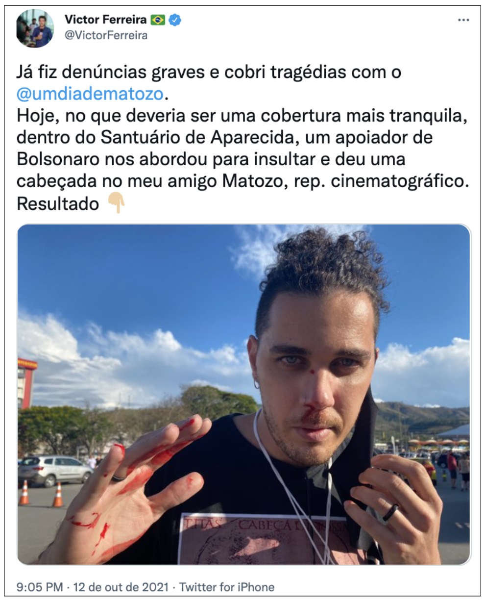 Um bolsonarista que trabalhava numa escola estadual de Mogi das Cruzes, na Grande São Paulo, deu uma forte cabeçada no cinegrafista Leando Matozo, da GloboNews, no Santuário de Nossa Senhora Aparecida, na região do Vale do Paraíba, enquanto o profissional cobria a festa da Padroeira do Brasil.