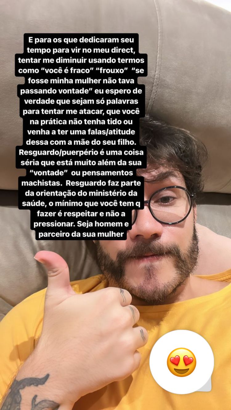 "E para os que dedicaram seu tempo para vir no meu direct tentar me diminuir usando termos como 'você é fraco', 'frouxo', 'se fosse minha mulher não tava passando vontade', eu espero de verdade que sejam só palavras para tentar me atacar, que você na prática não tenha tido ou venha a ter uma atitude dessa com a mãe do seu filho.