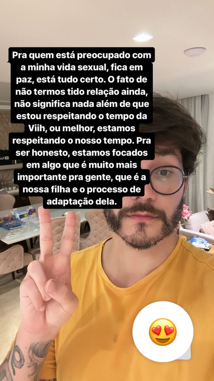"Pra quem está preocupado com a minha vida sexual, fica em paz, está tudo certo. O fato de não termos tido relação ainda não significa nada além de que estou respeitando o tempo da Viih, ou melhor, estamos respeitando o nosso tempo. Para ser honesto, estamos focados em algo que é muito mais importante pra gente, que é a nossa filha e o processo de adaptação dela", declarou.