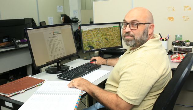 Arquiteto e urbanista Victor Nunes Marques em estação de trabalho no Implurb; em monitores, documentos e mapas
