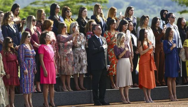 Na manhã desta terça-feira, Michelle foi a estrela da cerimônia no Alvorada. A própria primeira-dama hasteou uma das bandeiras, enquanto Bolsonaro ficou em frente a um palanque ocupado apenas por mulheres, entre autoridades e convidadas. Enquanto isso, a banda marcial da Presidência tocava músicas como "Maria, Maria", de Milton Nascimento.