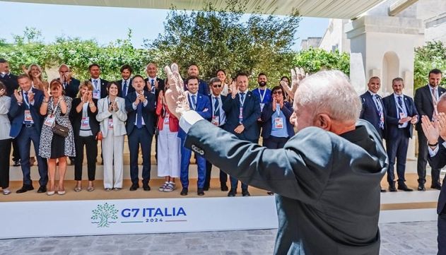G7 — Na sexta (14), o presidente Lula discursou na sessão de trabalho do G7 sobre inteligência artificial, energia, África e Mediterrâneo. Em sua oitava participação em cúpulas do grupo, Lula propôs a criação de uma governança global de inteligência artificial, defendeu a tributação de super-ricos e destacou a importância de conduzir uma revolução digital inclusiva e enfrentar a mudança do clima com foco na dignidade humana. No mesmo dia, teve reuniões bilaterais com o presidente francês, Emmanuel Macron; com a representante da Comissão Europeia, Ursula Von der Leyen; com o premiê da Índia, Narendra Modi; com o presidente da Turquia, Recep Erdo?an; e com o Papa Francisco.