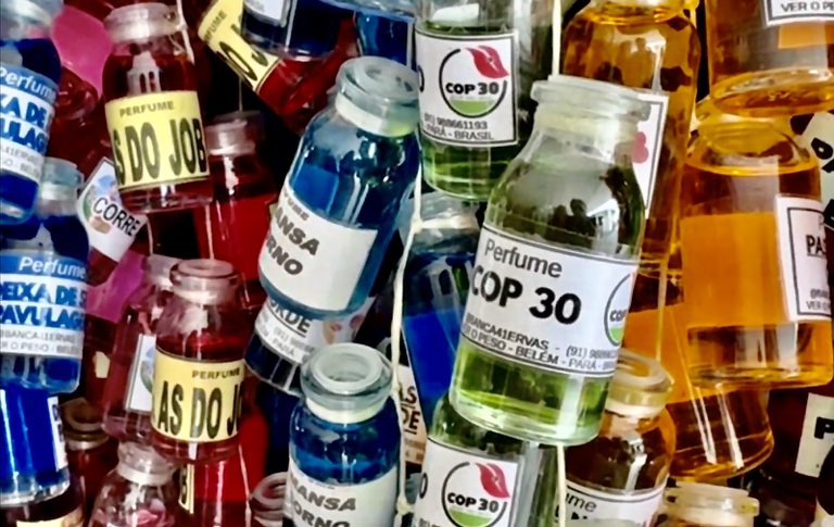 A erveira Maria Iracilda teve a ideia de criar um perfume especial para a COP30, cujo segredo das propriedades ela não revela — mas garante que transmite “boas energias”. “É para trazer coisas boas para as pessoas que vão vir de fora e para elas lembrarem do nosso Pará. E também divulgar o nosso conhecimento, as nossas ervas, os nossos produtos da Amazônia. Nossos perfumes são sensacionais para eles, são novidade”, diz, mostrando o frasco com líquido verde e adesivado com o nome da COP30.