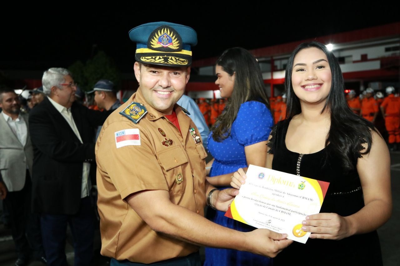 Conforme previsto em edital, a vencedora do concurso para a escolha da Canção do CBMAM, Débora Xavier, recebeu, durante a solenidade, a premiação de R$ 500 e falou sobre a emoção de fazer parte da construção desse novo passo na história da corporação.