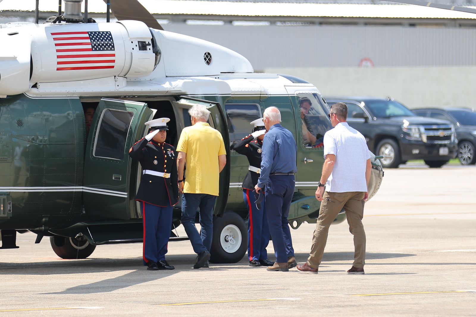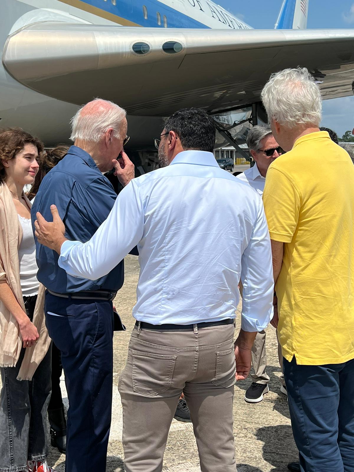 Joe Biden desembarcou em Manaus por volta das 12h30, no Aeroporto Internacional Eduardo Gomes, zona oeste, após cumprir agenda no Peru. Acompanhado da embaixadora dos Estados Unidos no Brasil, Elisabeth Frawley Bagley, o governador Wilson Lima cumprimentou o presidente norte-americano e agradeceu pela visita ao Amazonas, reforçando as relações diplomáticas entre os países.
