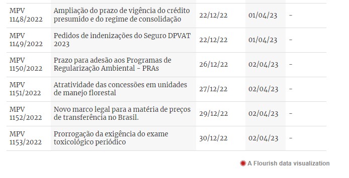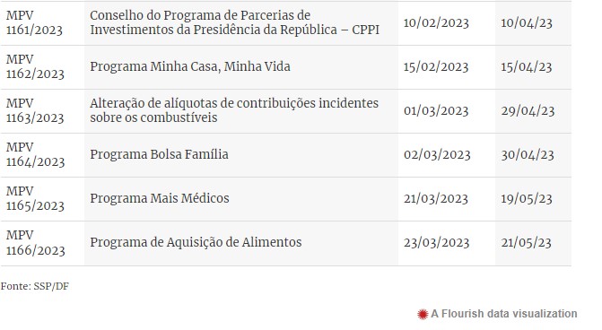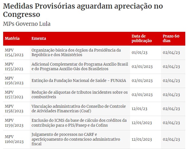 Publicadas entre janeiro e março deste ano, as MPs editadas por Lula ainda preveem uma pequena folga até o fim da validade. Todas têm vencimento entre abril e maio deste ano, meses em que as matérias completam 60 dias desde a publicação.