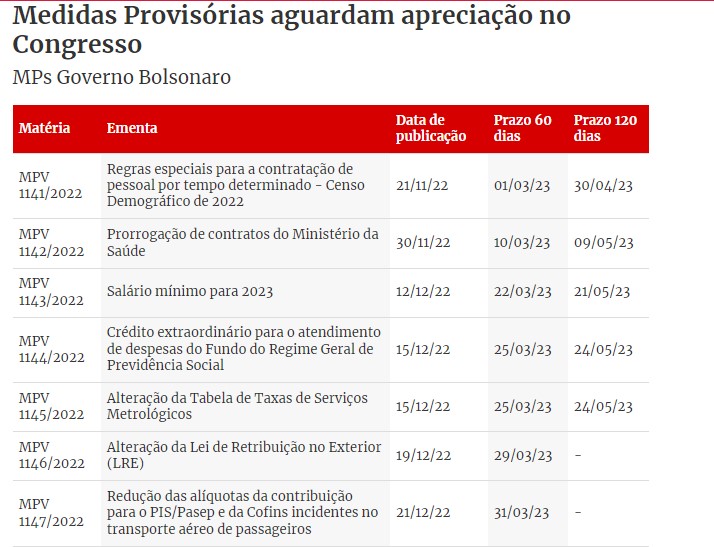 Com prazo mais apertado para apreciação do Congresso, as 13 medidas provisórias editadas por Bolsonaro devem ser apreciadas na próxima semana pela Câmara dos Deputados. Na lista, há medidas como a atualização do salário mínimo para 2023 e a contrataçaõ de pessoal para a realização do Censo Demográfico 2023.