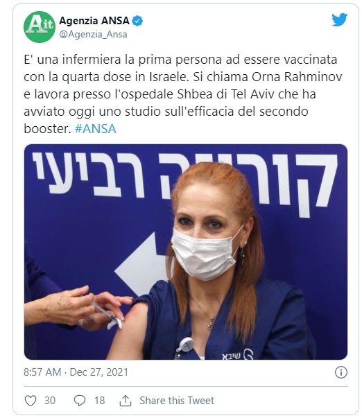 Orna Rahminov, uma enfermeira de um hospital de Tel Aviv se tornou a primeira pessoa a receber a quarta dose da vacina contra a Covid-19 em Israel.
