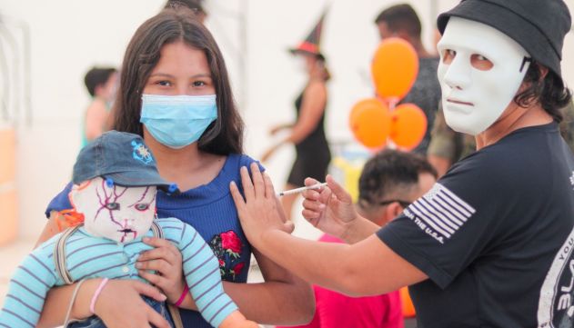 Quem foi ao ponto estratégico de vacinação contra a Covid-19, da Prefeitura de Manaus, que funciona no Shopping Phelipe Daou, localizado no bairro Cidade de Deus, na zona Norte, neste sábado, 30/10, foi recepcionado por bruxas, fantasmas, bonecos, palhaços e outros personagens ligados à temática do Dia das Bruxas. A proposta foi desenvolvida por servidores da Secretaria Municipal de Saúde (Semsa) para estimular a vacinação de forma divertida e lúdica.