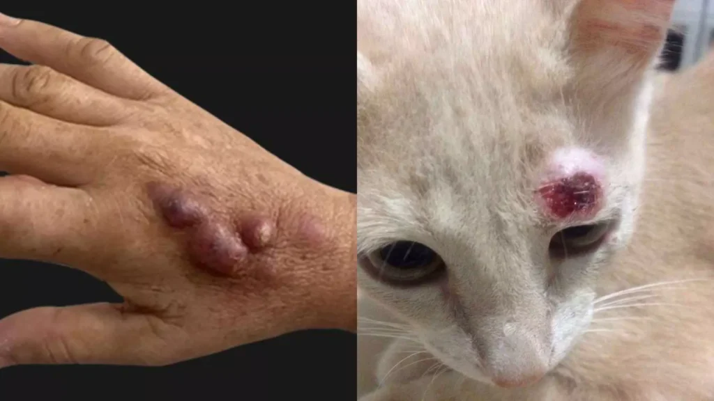 Os animais também podem ser transmissores da doença, passando o fungo para humanos e outros animais por arranhaduras, mordeduras, lambeduras ou pelo contato com secreções respiratórias e lesões cutâneas ou nas mucosas.