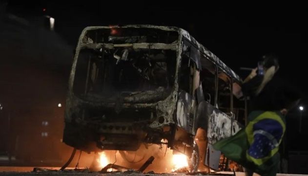 Manifestantes bolsonaristas botam fogo em ônibus durante protesto em Brasília