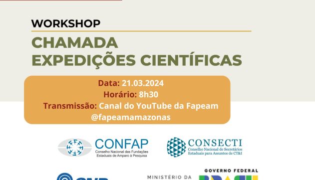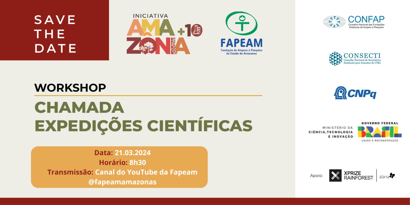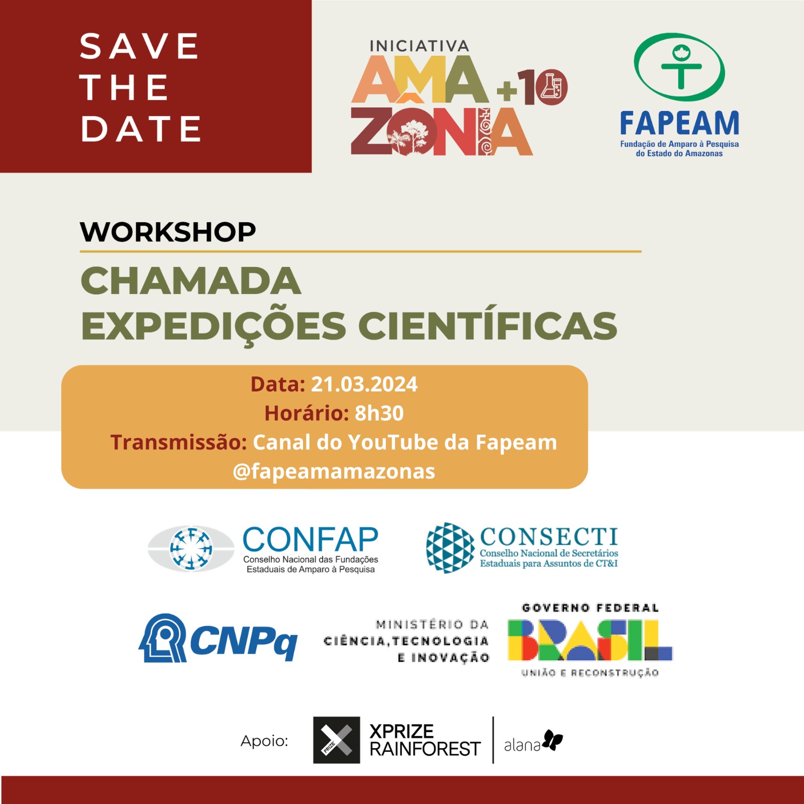 Pesquisadores interessados em concorrer à chamada da Iniciativa Amazônia + 10-Expedições Científica, que recebe propostas até dia 29 de abril, têm a oportunidade de esclarecer dúvidas relacionadas ao edital durante o workshop promovido pela Fundação de Amparo à Pesquisa do Estado do Amazonas (Fapeam), em parceria com o Conselho Nacional das Fundações Estaduais de Amparo à Pesquisa (Confap), Conselho Nacional de Secretários para Assuntos de Ciência Tecnologia e Inovação (Consecti) e Conselho Nacional de Desenvolvimento Científico e Tecnológico (CNPq).