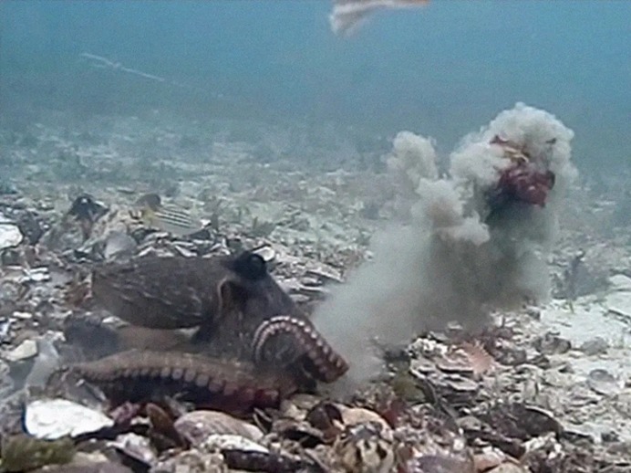As observações foram feitas em águas australianas e registradas em vídeo. O material demonstra que o comportamento das fêmeas envolve segurar o detrito entre os braços e projetá-lo com força por meio de jatos de água expelidos pelo sifão, permitindo mirar com precisão no alvo indesejado. Os arremessos mais intensos ocorrem justamente quando o alvo é um macho que tenta se aproximar para o acasalamento.
