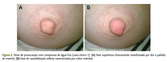 Essa diminuição de fluxo sanguíneo provoca uma alteração da cor do mamilo – sequencialmente ele se torna pálido, arroxeado e depois vermelho. Essa alteração trifásica costuma ser associada a dor, sensação de queimação ou formigamento.