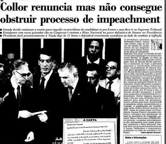 Em 1992, diante de fortes denúncias de corrupção relatadas pelo próprio irmão, Pedro Collor, e após uma CPI, o Congresso iniciou o processo de impeachment. Collor renunciou momentos antes da votação final, mas o Senado manteve a cassação de seus direitos políticos por oito anos.