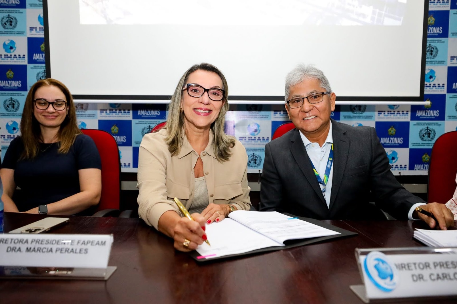Assinaram o termo, o diretor presidente da Fuham, Carlos Chirano, e a diretora presidente da Fapeam, Márcia Perales. O termo prevê a concessão de seis bolsas a serem destinadas à vinda de professores visitantes nacionais, e mais quatro bolsas de apoio à pesquisa. “Esse termo é uma relevância muito grande para impulsionar a pesquisa na Fundação Alfredo da Matta. Com certeza isso vai resultar em grandes projetos, na publicação de grandes artigos científicos e auxiliar na elaboração da Saúde Pública do estado. Esses projetos são pesquisas que redundam, que estão vinculadas à assistência de rotina” afirmou Chirano ressaltando que toda pesquisa realizada na Fuham tem resultado direto na assistência à população e na melhoria do atendimento dos pacientes.