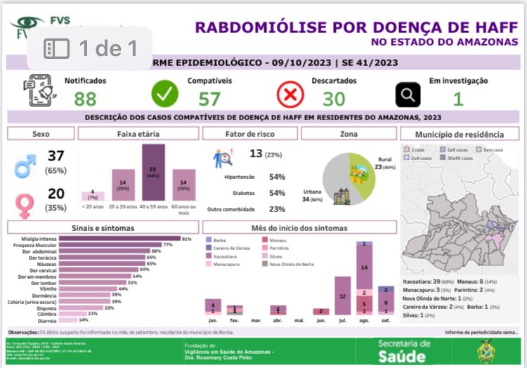 A FVS-RCP esclarece que a equipe do Centro de Informações Estratégicas em Vigilância em Saúde (Cievs) no Amazonas realiza rastreio, em parceria com as equipes de Vigilância Epidemiológica municipais, sobre a identificação dos casos que atendem à definição de caso suspeito de rabdomiólise compatível com a Doença de Haff, resultando no quantitativo de 57 casos compatíveis.
