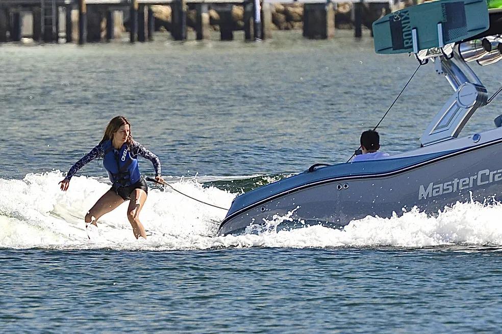 A modelo de 42 anos de idade foi fotografada praticando wake board. Nas imagens, Gisele aparece segurando no cabo acoplado ao barco e também usa um colete salva-vidas para sua segurança.