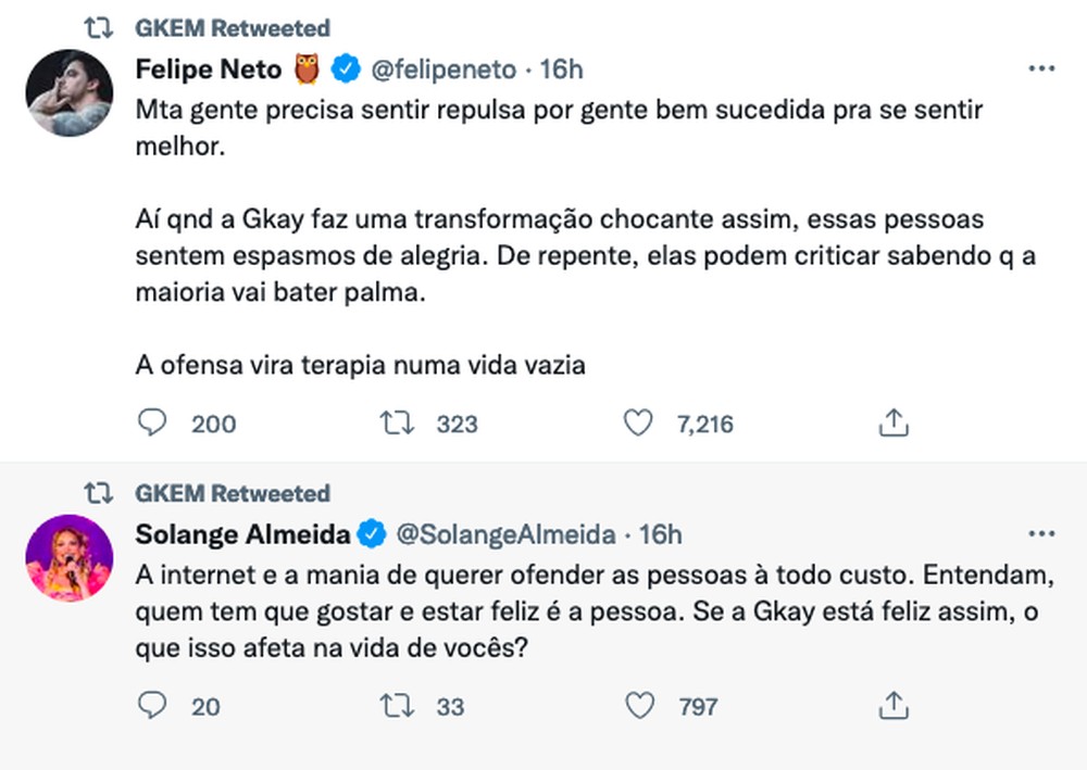 Depois do desabafo, Felipe Neto saiu em defesa da influencer: "Muita gente precisa sentir repulsa por gente bem-sucedida para se sentir melhor. Aí quando a Gkay faz uma transformação chocante assim, essas pessoas sentem espasmos de alegria. De repente, elas podem criticar sabendo que a maioria vai bater palma. A ofensa vira terapia numa vida vazia", escreveu o youtuber."