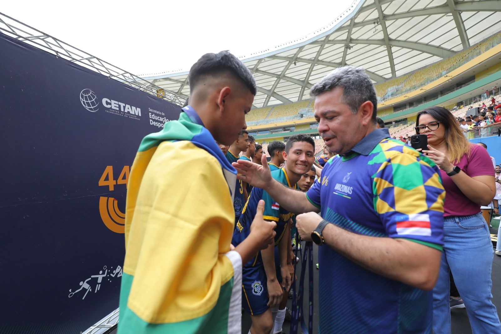 O governador do Amazonas em exercício, Tadeu de Souza, conduziu, no sábado (22/07), o encerramento da 44ª edição dos Jogos Escolares do Amazonas (JEAs), na Arena da Amazônia, principal palco do futebol amazonense. A cerimônia premiou com medalhas e troféus os estudantes-atletas finalistas do futebol de campo, nas categorias infantil e juvenil.