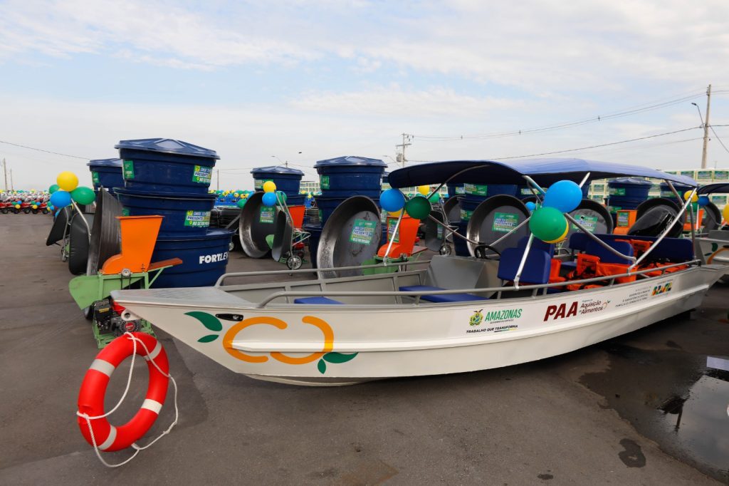 A solenidade, realizada no Parque Multiuso de Exposição Agropecuária Dr. Eurípedes Ferreira Lins, em Manaus, marcou uma das maiores entregas já realizadas pelo Governo do Amazonas para o segmento. O objetivo foi fortalecer a logística, ampliar a produtividade e promover a geração de renda no campo, garantindo mais competitividade e qualidade de vida para quem vive da agricultura e da pesca.Pela Secretaria de Estado de Produção Rural (Sepror), o investimento foi destinado a aquisição de veículos, embarcações e implementos. Entre as entregas estavam 12 embarcações fluviais para transporte de produtos e pessoas em comunidades ribeirinhas, dois caminhões frigoríficos para produtos perecíveis e seis pick-ups para deslocamentos e transporte de cargas leves, fruto de parceria com o Ministério do Desenvolvimento e Assistência Social, Família e Combate à Fome (MDS), além de 40 triciclos para apoio no escoamento das colheitas.