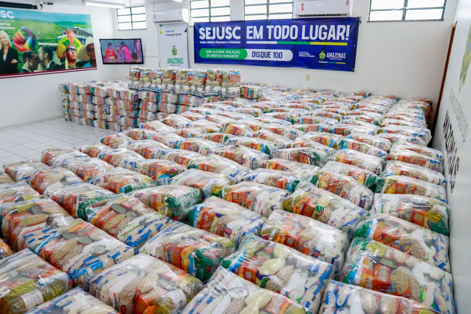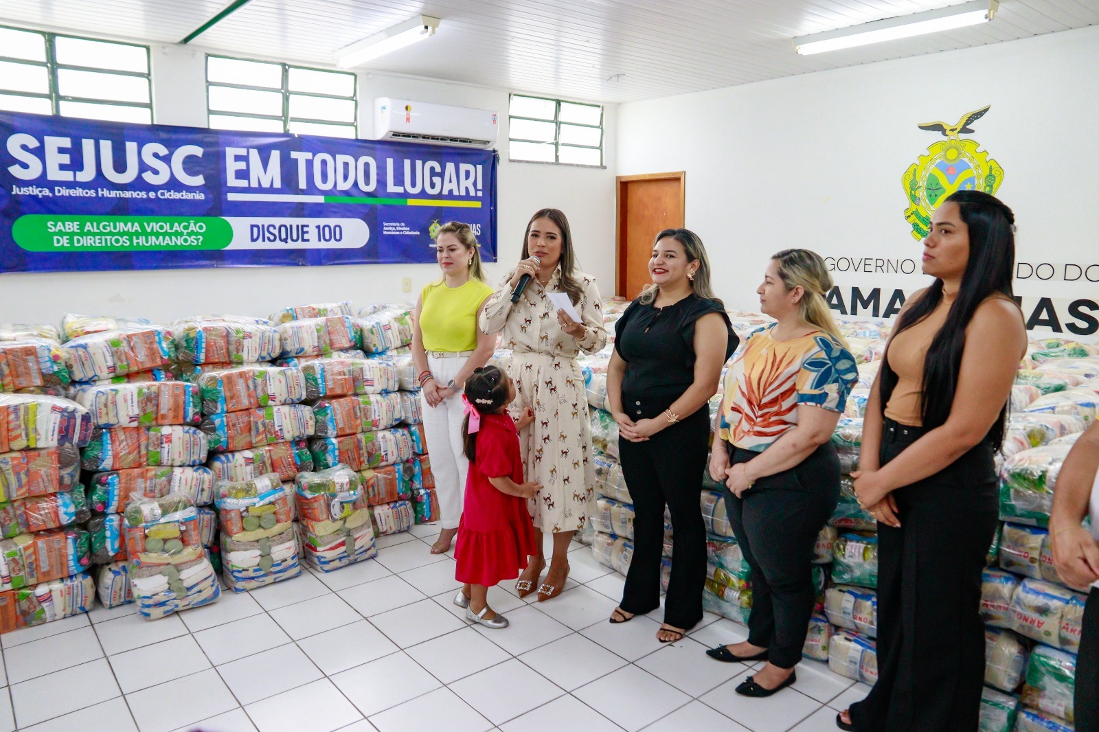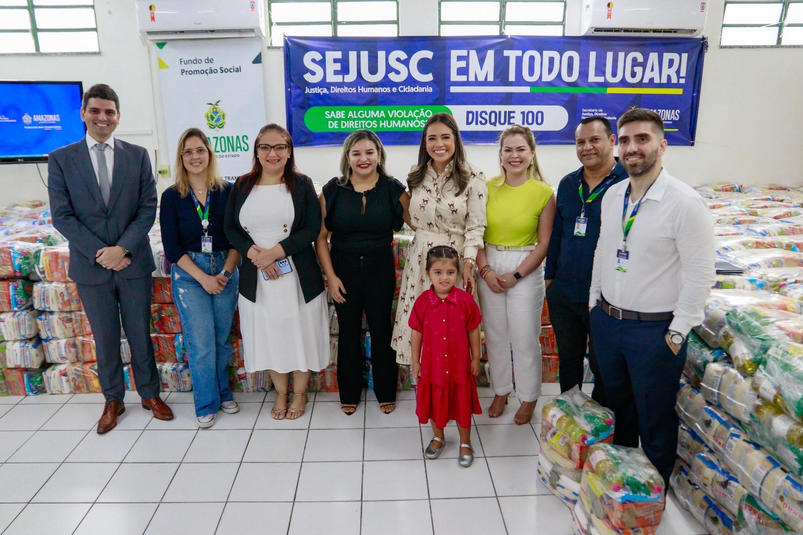 O Governo do Amazonas, por meio da Secretaria de Estado de Justiça, Direitos Humanos e Cidadania (Sejusc) e do Fundo de Promoção Social (FPS), iniciou, nesta quinta-feira, 21, a entrega de cestas de alimentos para Organizações da Sociedade Civil (OSCs) contempladas no Edital de Credenciamento nº 001/2023-SEJUSC. A entrega inicial foi feita pela primeira-dama do Amazonas, Taiana Lima.